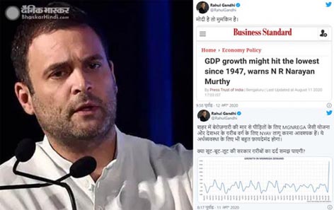 नईदिल्ली। कांग्रेस के पूर्व अध्यक्ष राहुल गांधी ने इन्फोसिस के संस्थापक एनआर नारायणमूर्ति की ओर से सकल घरेलू उत्पाद (जीडीपी) में आजादी के बाद की सबसे बड़ी गिरावट की आशंका जताए जाने को लेकर बुधवार को प्रधानमंत्री नरेंद्र मोदी और सरकार पर कटाक्ष किया। उन्होंने नायरायणमूर्ति के बयान वाली एक खबर का हवाला देते हुए ट्वीट किया, ”मोदी है तो मुमकिन है। गौरतलब है कि नारायणमूर्ति ने मंगलवार को आशंका जताई कि कोरोना वायरस महामारी के चलते इस वित्त वर्ष में देश की आर्थिक गति आजादी के बाद सबसे खराब स्थिति में होगी। उन्होंने कहा कि अर्थव्यवस्था को जल्द से जल्द पटरी पर लाया जाना चाहिये। उन्होंने यह आशंका भी जताई कि इस बार जीडीपी में स्वतंत्रता के बाद सबसे बड़ी गिरावट दिख सकती है।