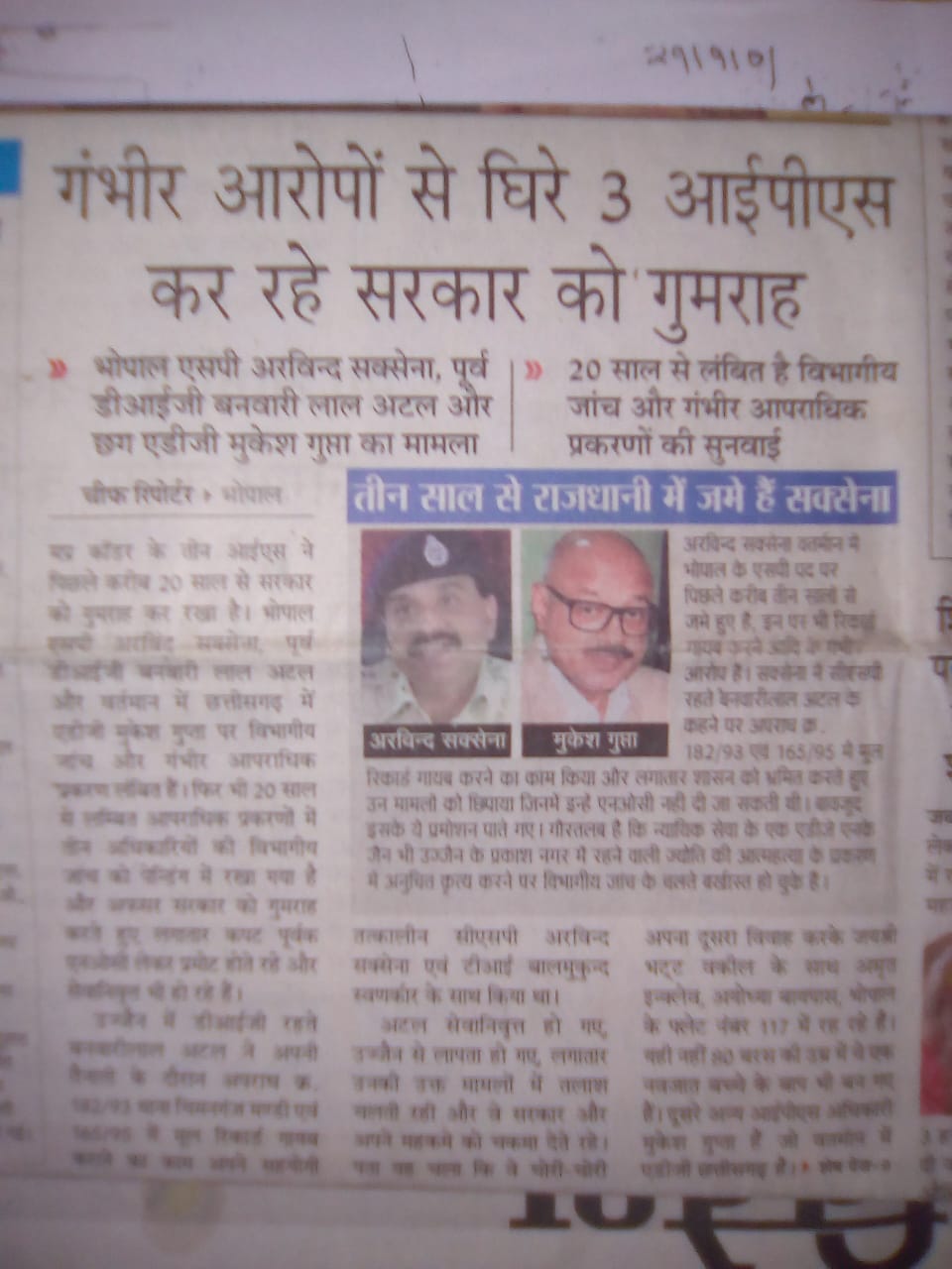 रायपुर . मालवा से मिली खबरों में बताया जा रहा है की अपने पुराने विश्वस्त वकील तथा पूर्व सहयोगी छोटे पुलिस अधिकारियो की मदद से मुकेश गुप्ता उज्जेन और इनडोर के इलाके में अक्सर देखा जा रहा है , सफ़ेद और काले रंग के बालों की विग का प्रयोग उसके द्वारा पहचान छुपाने के लिए किया जा रहा है , ऐसे पुराने पुलिस कर्मचारी, जिनकी मदद अपने उज्जेन में एस पी रहते समय उसने की थी , आज उनकी भरपूर मदद आई पी एस मुकेश गुप्ता को मिल रही है .