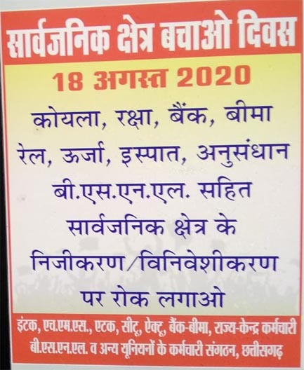 छत्तीसगढ़:- करोना की आड़ में इस पूरे दौर में अर्थव्यवस्था और गरीब जनता बदहाल हो गई, वही। अदानी, अंबानी जैसे कोरपोरेट मालामाल हो रहे है। इन्ही देशी और विदेशी कोरपोरेटों के हाथ देश की संपदा लुटाई जाने की कवायद जारी है। इन हालातों में अखिल भारतीय स्तर पर सभी 10 केंद्रीय श्रमिक संगठनों, विभिन्न स्वतंत्र महासंघों और एसोसिएशनों न ने 18 अगस्त को निजीकरण विरोधी, सार्वजनिक क्षेत्र बचाओ दिवस के तौर पर मनाने का आह्वान किया है। इस आव्हान पर कल पूरे प्रदेश में सभी संगठनों के कार्यकर्ता अपने कार्यस्थलों में।प्रदर्शन कर प्रधनमंत्री के नाम ज्ञापन सौंपेंगे ।