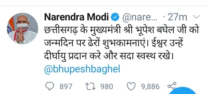 नईदिल्ली। प्रधानमंत्री नरेन्द्र मोदी ने रविवार को छत्तीसगढ़ के मुख्यमंत्री भूपेश बघेल को जन्मदिन की शुभकामनाएं देते हुए उनके दीर्घायु और स्वस्थ जीवन की कामना की है। बघेल आज 59 वर्ष के हो गए। मोदी ने शुभकामना संदेश में कहा,छत्तीसगढ़ के मुख्यमंत्री भूपेश बघेल जी को जन्मदिन पर ढेरों शुभकामनाएं। ईश्वर उन्हें दीर्घायु प्रदान करे और सदा स्वस्थ रखे।