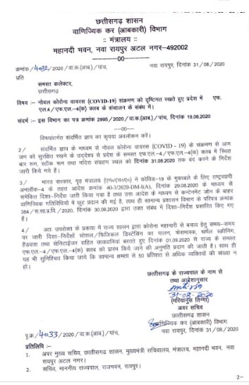 रायपुर । छत्तीसगढ़ की राजधानी रायपुर से एक बड़ी खबर मिली है । खबर है कि छत्तीसगढ़ प्रदेश में राज्य सरकार ने आज 1 सितंबर से बार और क्लब को खोलने की अनुमति दे दी है । रेस्टोरेंट और होटल स्थित बार और क्लब को खोला जा सकेगा । हालांकि कोरोना गाइडलाइन का पालन करना और क्षमता से 50 प्रतिशत ही लोगों को आने की अनुमति होगी । इसके साथ ही सोशल डिस्टेसिंग का पालन, फेस मास्क, थर्मल स्क्रीनिंग, हैंड वाश के साथ सभी एफएल-3 होटल बार, एफएल-3 होटल शुरु करने की अनुमति होगी ।