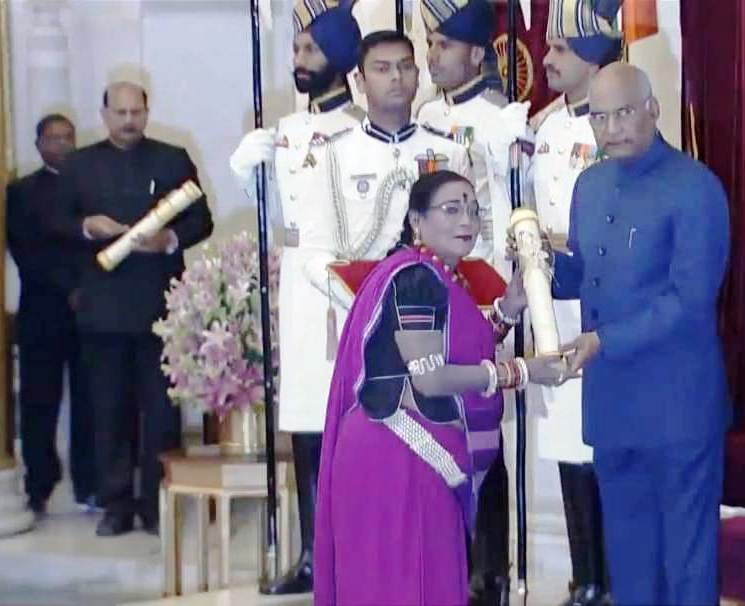 रायपुर, राष्ट्रपति श्री रामनाथ कोविंद ने आज राष्ट्रपति भवन में आयोजित समारोह में छत्तीसगढ़ की प्रसिद्ध पंडवानी गायिका डॉ. तीजन बाई को पद्म विभूषण और बस्तर बैण्ड के अनूप रंजन पाण्डेय को पदमश्री अलंकरण से सम्मानित किया.सांस्कृतिक क्षेत्र के इन सशक्त हस्ताक्षरों में दोनों का राज्य की कला को देश विदेश में प्रतिष्ठित करने में महत्वपूर्ण स्थान रहा है