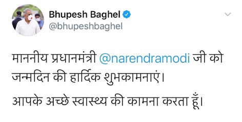 Home छत्तीसगढ़ मुख्यमंत्री बघेल ने प्रधानमंत्री मोदी को दी जन्मदिन की शुभकामनाएं छत्तीसगढ़रायपुर संभागरायपुर जिला मुख्यमंत्री बघेल ने प्रधानमंत्री मोदी को दी जन्मदिन की शुभकामनाएं By ADMIN - September 17, 2020 527 0 FacebookTwitterPinterestWhatsApp रायपुर। प्रधानमंत्री नरेन्द्र मोदी के जन्मदिवस पर छत्तीसगढ़ के मुख्यमंत्री भूपेश बघेल ने उन्हें शुभकामनाएं दी है। श्री बघेल ने ट्वीट करते हुए प्रधानमंत्री श्री मोदी को जन्मदिन की हार्दिक शुभकामनाएं देते हुए उनके अच्छे स्वास्थ्य की कामना की है।