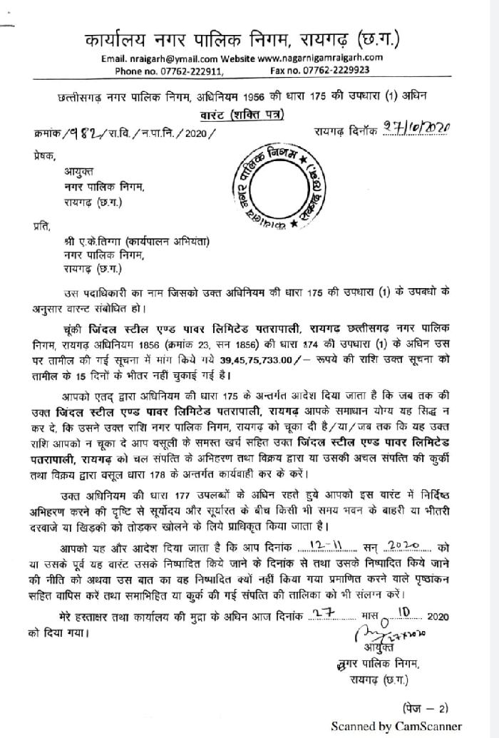 मिली जानकारी के अनुसार जिंदल स्टील एंड पावर लिमिटेड ने नगर निगम रायगढ़ को टैक्स का भुगतान नहीं किया है नगर निगम ने लगभग 39 करोड़ रुपए का टैक्स जमा करने जीएसपीएल को नोटिस दिया है लेकिन नोटिस के बाद भी जेएसपीएल प्रबंधन उक्त टैक्स की राशि को जमा नहीं कर रहा है। ऐसे में नगर निगम आयुक्त आशुतोष पांडे ने बड़ा फैसला लेते हुए जिंदल के विरुद्ध वारंट जारी कर दिया है ।