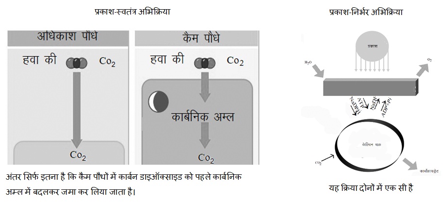 अधिकांश पौधों में यही चरण होते हैं। इन सामान्य पौधों के अलावा कुछ ऐसे भी पौधे हैं जो रेगिस्तानी परिस्थितियों में उगते हैं। यहां पानी की कमी होती है और गर्मी अधिक होती है। लिहाज़ा, पानी बचाने के लिए इन पौधों के स्टोमैटा दिन में बंद रहते हैं और रात में खुलते हैं। इन्हें क्रेसुलेसियन एसिड मेटाबोलिज़्म (कैम) पौधे कहा जाता है। इस प्रक्रिया को सबसे पहले क्रेसुलेसी कुल के पौधों में खोजा गया था।
