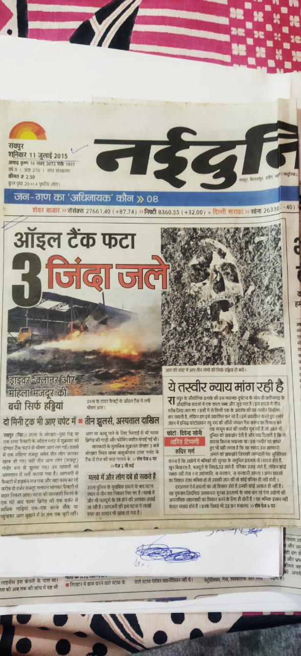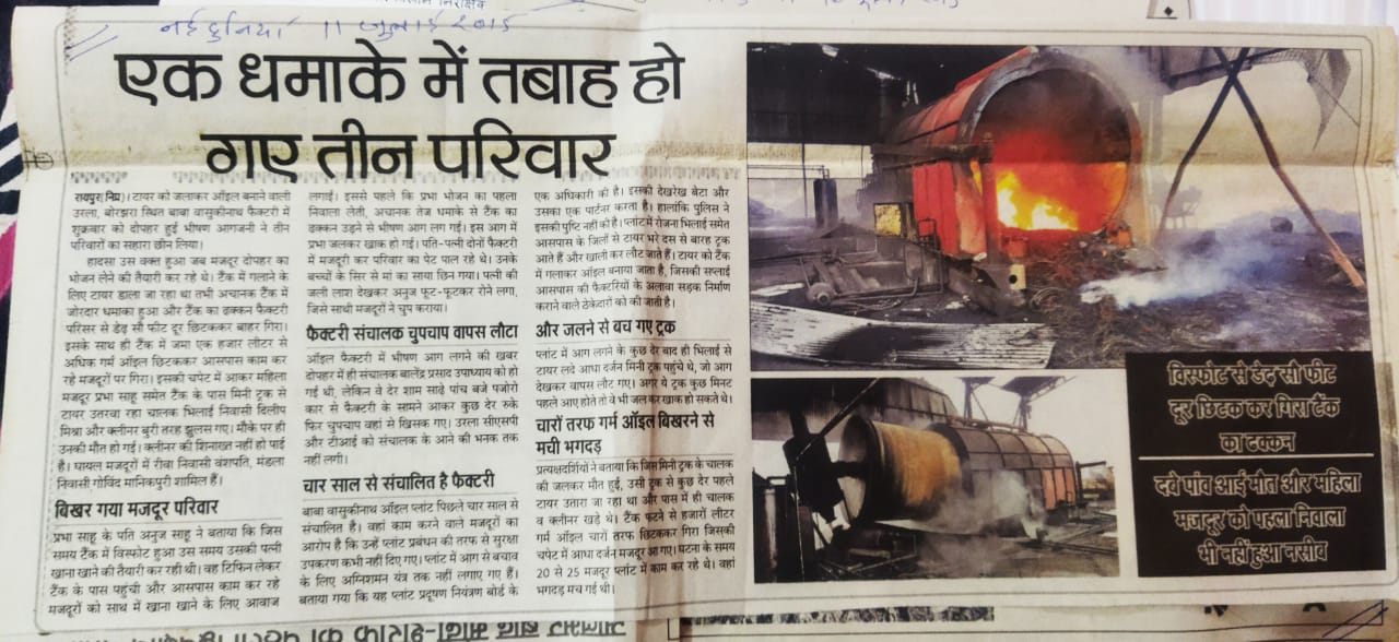 रायपुर ( इंडिया न्यूज विशेष ) राजधानी की रोज की खबरों में जो बातें पुरानी हो कर अक्सर दब जाती हैं और न्याय की कोशिशों को अक्सर बाद में मीडिया का सहयोग नही मिल पाता और खासकर गरीबों का दोहरा नुकसान हो जाता है। ये घटना है आज से 7 साल पहले उरला के बोरझरा स्थित कंपनी “बाबा बासुकीनाथ टायर ऑइल प्लांट” में विस्फोट का मामला जो कि अदालत के फैसले के बाद फिर से गरमाने लगा है. इलाके के लोगों द्वारा अवैध रूप से संचालित इस फैक्ट्री के संचालक भालेंद्र उपाध्याय को प्रकरण में आरोपी बनाया गया था , अब भालेंद्र उपाध्याय के बरी होने के बाद इस विस्फोट से मारे गए 4 मृतक मजदूरों के परिजनों को न्याय नहीं मिलने पर पुलिस व अदालत पर सवाल उठ रहे हैं. इलाके के सामाजिक कार्यकर्ता विक्रम सिंह चौहान ने तत्कालीन निरीक्षक उरला थाना मीना चौधरी, आरोपी भालेंद्र उपाध्याय व उनके पिता तत्कालीन पर्यावरण अधिकारी रायपुर संतोष कुमार उपाध्याय पर गंभीर आरोप लगाते हुए सैकड़ो पेज दस्तावेज सहित पुलिस महानिदेशक व पुलिस अधीक्षक रायपुर को शिकायत किया है .शिकायत में कहा गया है कि आरोपियों द्वारा अदालत में पेश दस्तावेज झूठे हैं,मनगढ़ंत व पूर्व तारीखों के फर्जी रूप से बनाया गया है.