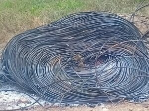 बीजापुर, 31 अक्टूबर 2023, बीजापुर से बासागुड़ा के आगे जगरगुंडा तक जारी सड़क निर्माण के दौरान किनारे बिछाए जा रहे केबल के बंडल को सड़क किनारे जला हुआ पाया गया।