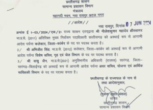दूसरी ओर 2021 बैच के आईएएस वासु जैन को सारंगढ़ एसडीएम से वापिस बुलाकर उन्हें मंत्रालय में योजना और सांख्यिकी विभाग में अवर सचिव बनाया गया है।