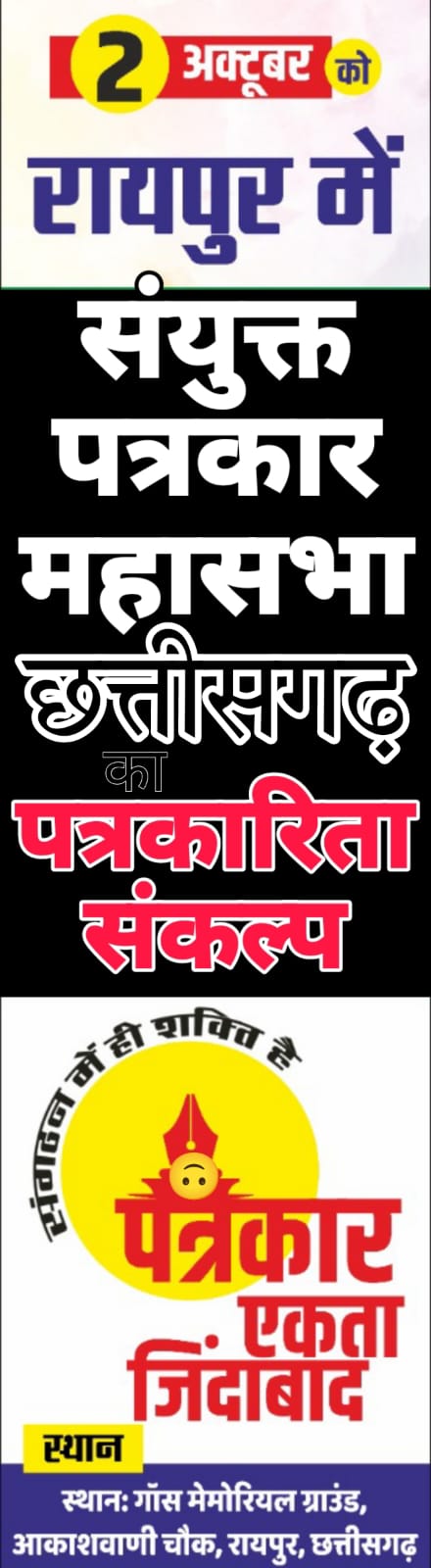 रायपुर 29 सितंबर 2024 ।छत्तीसगढ़ में पहली बार प्रदेश के 30 से अधिक पत्रकार , मीडिया कर्मियों के संगठन एक मंच पर आएंगे और पत्रकारों के हित में एकजुटता का परिचय देंगे। यह ऐतिहासिक पत्रकार महासभा 2 अक्टूबर 2024 को रायपुर के गॉस मेमोरियल ग्राउंड, आकाशवाणी चौक में आयोजित की जाएगी। इस कार्यक्रम में प्रदेश के विभिन्न जिलों से सैकड़ों पत्रकारों के आने की सूचना मिल रही है।