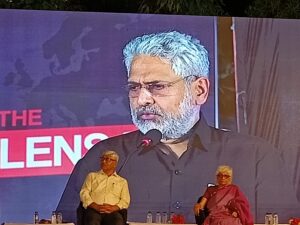 ( मुख्य वक्तव्य देते हुए “द वायर ” के संस्थापक संपादक सिद्धार्थ वरदराजन)