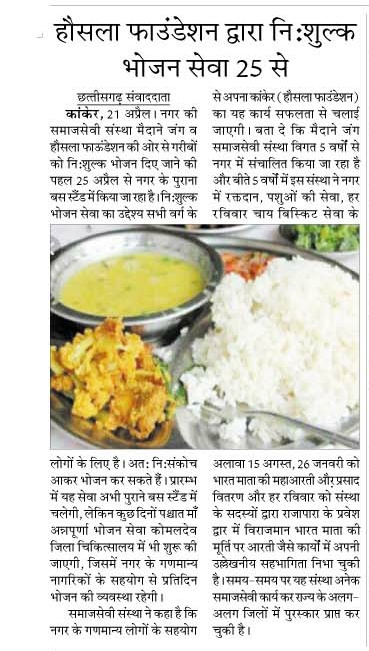 कांकेर. ” हौसला फाउंडेशन ” कांकेर ने स्थानीय पुराने बस स्टैंड में आज गुरुवार से नि:शुक्ल अन्नपूर्णा दाल भात सेंटर का शुभारंभ किया है जो फिलहाल हर गुरुवार को संचालित रहेगा पर आने वाले दिनों में इसे एक नयी दिशा देकर हर दिन नि:शुल्क भोजन कराने की जिम्मेदारी खेमनारायण शर्मा और इस फाउंडेशन के सदस्यों ने उठायी है .