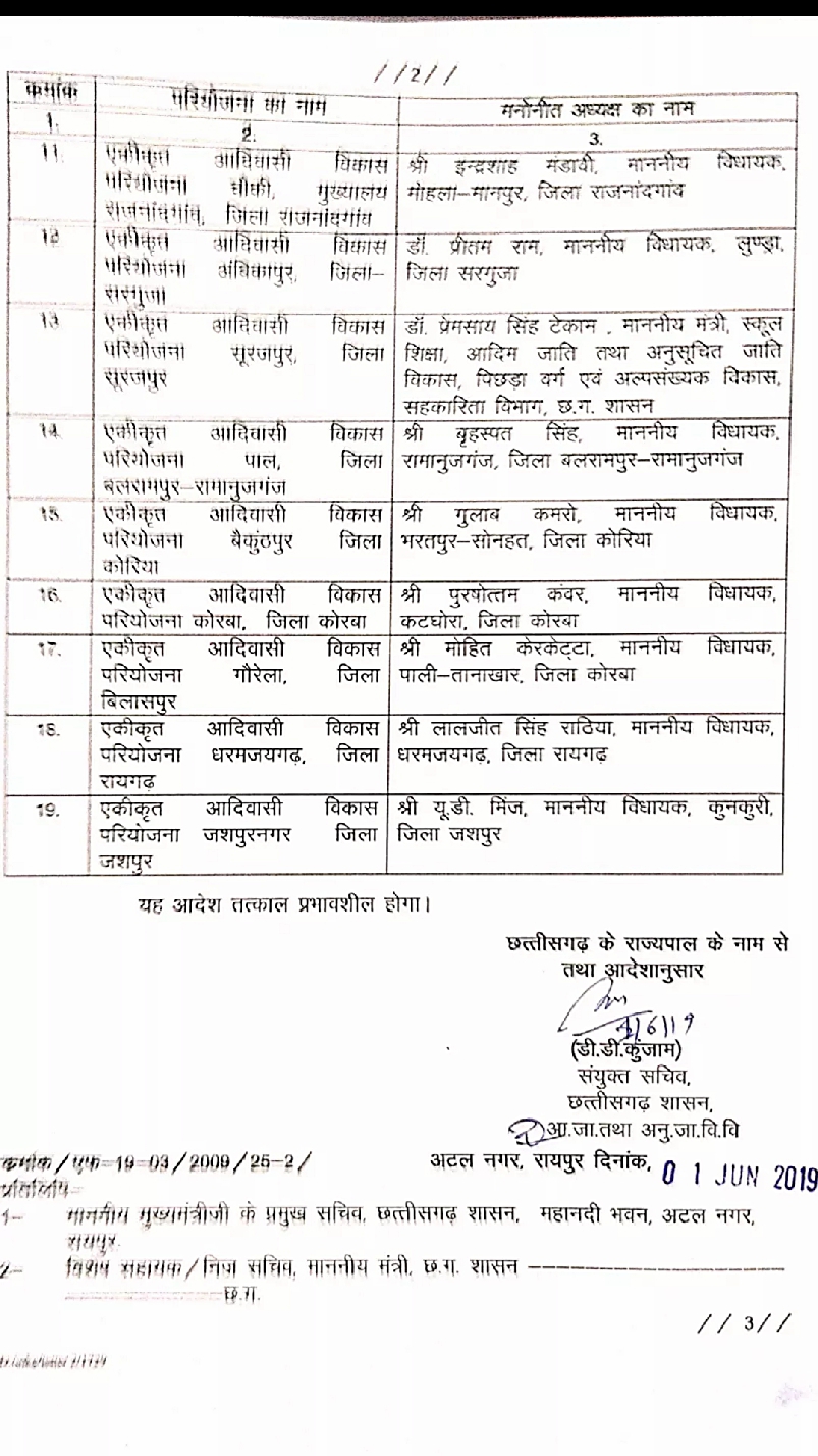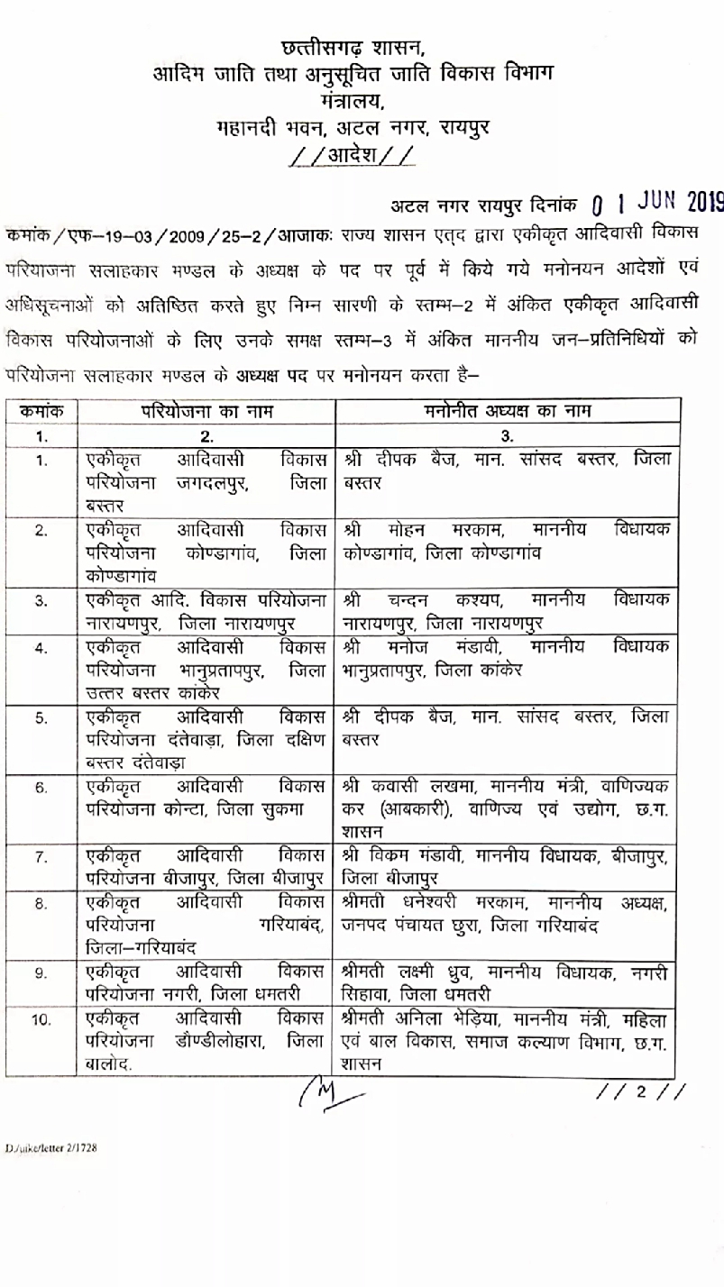 रायपुर (इंडिया न्यूज रूम) 3 जून, 2019 कांग्रेस के आदिवासी विधायकों को आदिवासी विकास परियोजना की जिम्मेदारी मिली है. जिसमें तीन मंत्रियों को भी शामिल किया है.छत्तीसगढ़ में आदिवासी विकास परियोजना सलाहकार मंडल के अध्यक्ष पद के लिए नियुक्त कर दी है. 19 आदिवासी परियोजना के जिलों में अध्यक्ष की निुयक्ति की गई है. इसमें दंतेवाड़ा औऱ बस्तर में विधायक और सासंद दीपक बैज की अध्यक्ष बनाया गया है. इसके अलावा मंत्री प्रेमसाय सिंह को सूरजपुर, मंत्री कवासी लखमा को सुकमा और मंत्री अनिला भेड़िया को बालोद का आदिवासी विकास परियोजना का अध्यक्ष बनाया गया है.