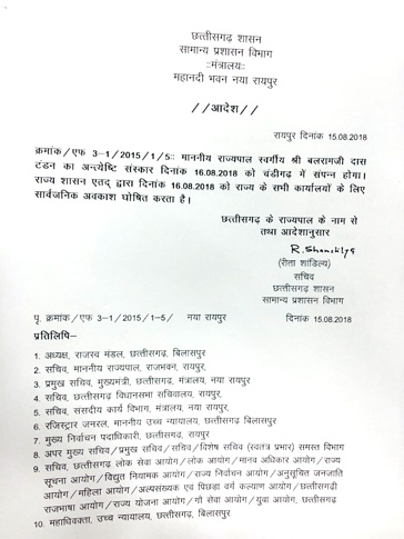 रायपुर: छत्तीसगढ़ के राज्यपाल बलरामजीदास टंडन के निधन के कारण राज्य शासन द्वारा 7 दिन का राजकीय शोक घोषित किया गया है. कल 16 अगस्त को स्वर्गीय टंडन जी का अंतिम संस्कारचंडीगढ़ पंजाब में किया जाएगा . छत्तीसगढ़ राज्य सरकार ने इसे ध्यान में रखते हुए सभी शासकीय कार्यालयों में 16 अगस्त को सार्वजनिक अवकाश की घोषणा की है . राज्य में वैसे भी 20 अगस्त तक राजकीय शोक प्रभावी रहेगा .जिसके चलते 16 अगस्त से 20 अगस्त तक राष्ट्रीय ध्वज आधा झुका रहेगा .