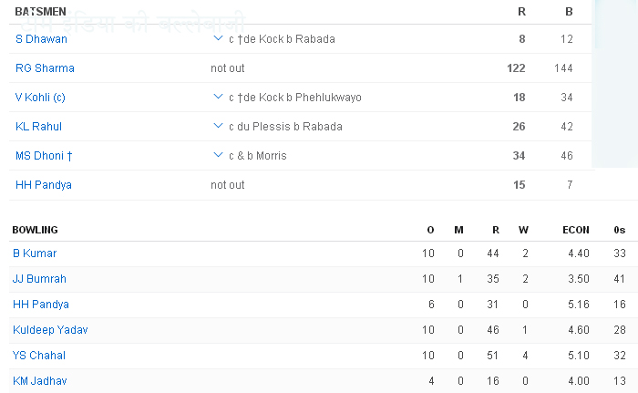 टॉस जीतकर बल्लेबाजी करने उतरी दक्षिण अफ्रीका टीम की शुरुआत अच्छी नहीं रही. 3.3 ओवर में जसप्रीम बुमराह में दक्षिण अफ्रीका को पहला झटका दिया. हाशिम अमला मात्र छह रन बनाकर पैवेलियन लौट गए. इस समय टीम का स्कोर 15 रन था. इसके बाद छठवें ओवर में बुमराह में फिर दक्षिण अफ्रीक को झटका दे दिया. क्विंटन डी कॉक कोहली के हाथों कैच आउट हो गए. इसके बाद भारतीय गेंदबाजों की घातक बॉलिंग के आगे अफ्रीकी टीम के खिलाड़ी घुटने टेकते गए. भारत की ओर युजवेंद्र चहल ने सबसे ज्यादा 4 विकेट लिए. दक्षिण अफ्रीका की ओर से क्रिस मॉरिस ने सर्वाधिक 42 रन बनाए. जबकि कप्तान फॉफ डु प्लेसिस ने 38 रनों की पारी खेली.