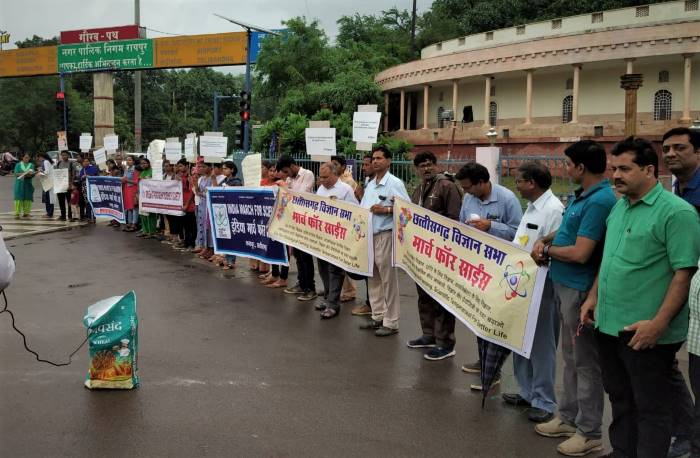 रायपुर.10अगस्त19 (इंडिया न्यूज रूम) देश भर में विज्ञान को हतोत्साहित करने के प्रयासों के खिलाफ़ विभिन्न वैज्ञानिक संस्थाओ के विज्ञान कार्यकर्ताओ, प्राध्यापकों, छात्र छात्राओं तथा सामाजिक कार्यकर्ताओं ने 9 अगस्त को “ मार्च फ़ॉर साइंस” निकाला गया , इस क्रम में रायपुर में छत्तीसगढ़ विज्ञान सभा , ब्रेकथ्रू साइन्स सोसायटी, रायपुर और विभिन्न संस्थाओ द्वारा आंबेडकर तिराहे, घड़ी चौक से तेलीबांधा तालाब मरीन ड्राइव तक ये मार्च निकाला गया. विज्ञान सभा के राज्य सचिव पी सी रथ ने शुरूआत में बताया कि भारत के संविधान में उल्लेखित होने के बावजूद वैज्ञानिक दृष्टिकोण को प्रोत्साहित करने के बजाय सत्तारूढ़ राजनैतिक ताकतों द्वारा अंधविश्वास और अवैज्ञानिक बातो को प्रोत्साहित किया जा रहा है जिसका भारत का वैज्ञानिक समाज खंडन करता है तथा देश के विकास के लिए वैज्ञानिक अनुसन्धान तथा शोध को प्रोत्साहित किये जाने पर जोर देता है. विगत कई वर्षों से देखा जा रहा है कि केंद्र सरकार वैज्ञानिक संस्थाओ का बज़ट कम करती जा रही है तथा मौलिक खोज को प्रोत्साहित करने की बजाय अनुसन्धान के लिए आवंटन कम करती जा रही है ऐसी स्थिति में अन्तराष्ट्रीय प्रतिस्पर्धा में कम आविष्कारों के कारण हमें जो आत्मनिभरता विज्ञान के क्षेत्र में हासिल करनी चाहिए वो हम नहीं प्राप्त कर पाएंगे, इस लिए इस विषय में जन चेतना भी बढ़ाना आवश्यक है.