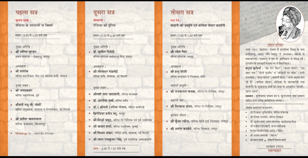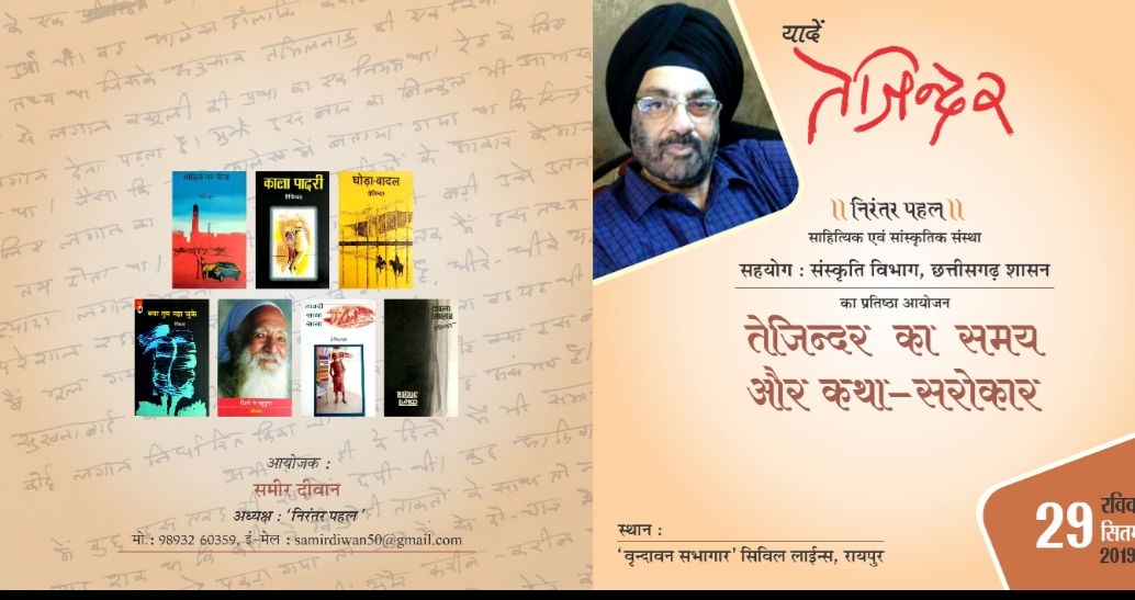 निरन्तर पहल साहित्यिक एवं सांस्कृतिक संस्था के अध्यक्ष समीर दीवान के मुताबिक़ संस्कृति विभाग के सहयोग से यह संगोष्ठी आयोजित है. अपनी संवेदनात्मक लेखन शैली के लिए जाने गए रायपुर के प्रसिद्ध उपन्यासकार तेजिन्दर की स्मृति में कार्यकम के तीन सत्र होंगे. पहला सत्र सृजन यात्रा तेजिन्दर के उपन्यासों पर केंद्रित होगा. इसमें समालोचक – जयप्रकाश,
