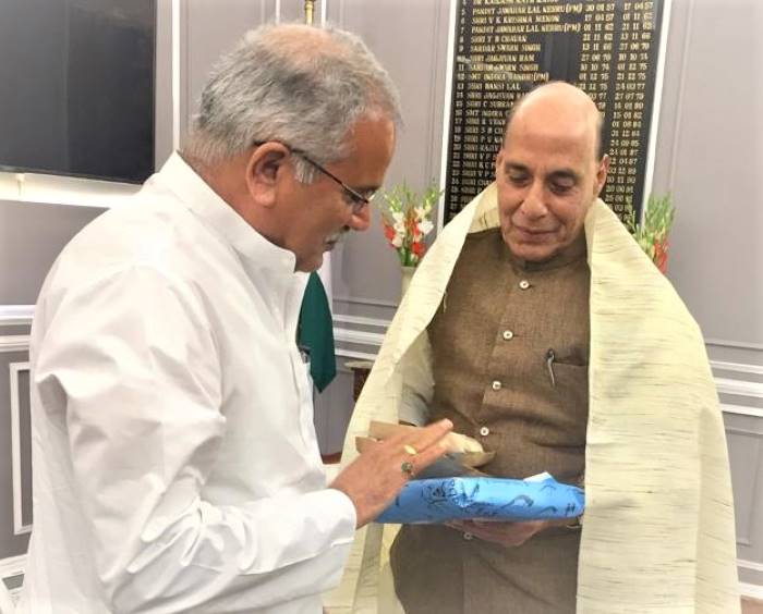 राजनाथ सिंह को छत्तीसगढ़ के ऑर्गेनिक चावल और राज्य के बुनकरों द्वारा बनाया नेचुरल डाई से तैयार कोसे का कुर्ता किया भेंट