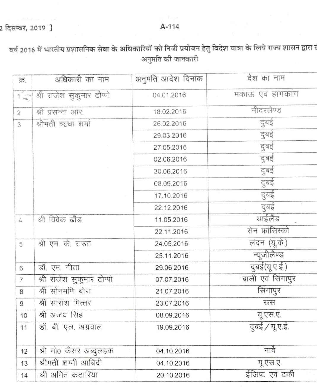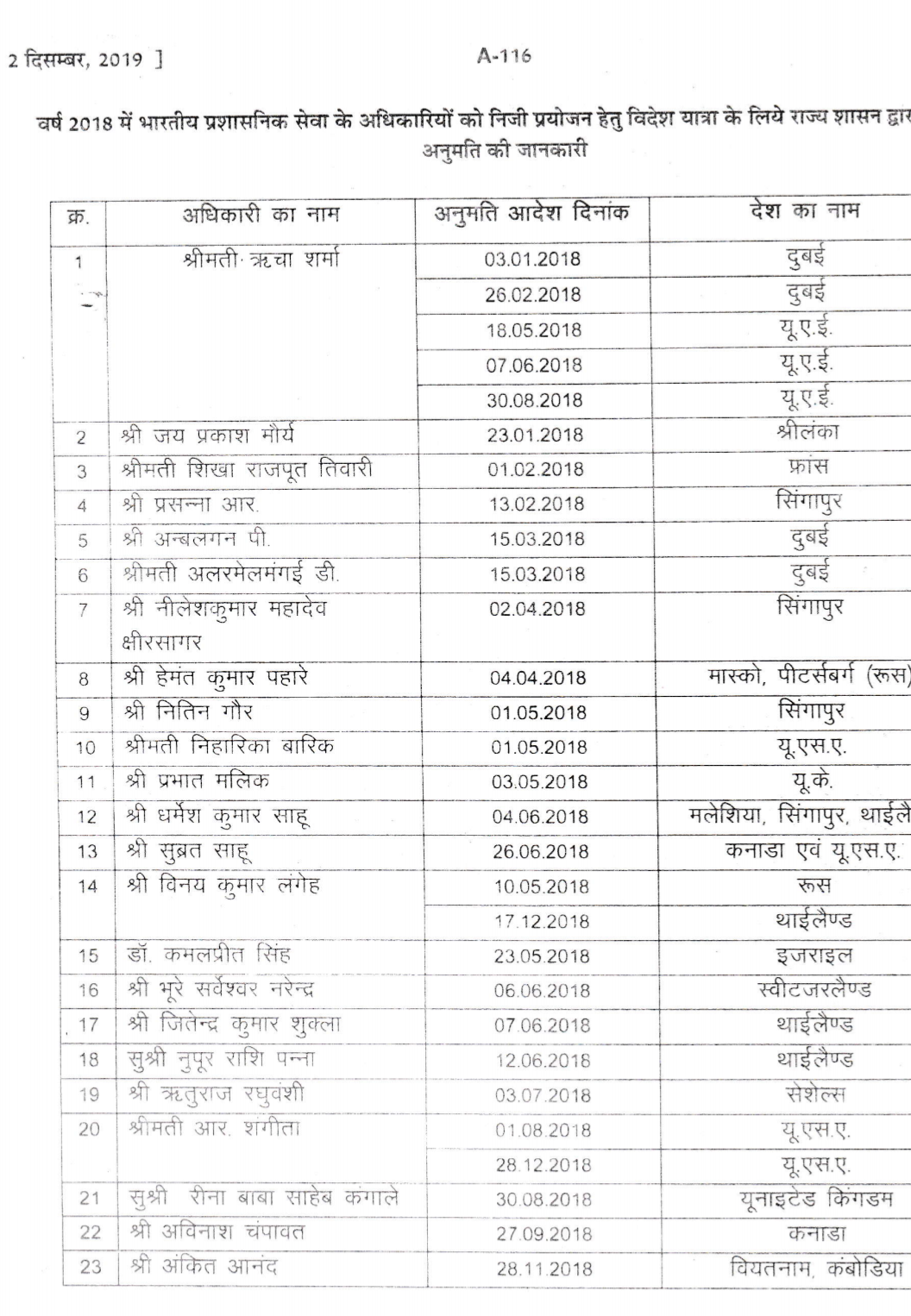 चार साल में 24 विदेश यात्राएं। ऋच्रा शर्मा के दुबई दौरे के आंकड़े को देखें तो 2016, 2017 और 2018 के सालों में वो लगभग हर महीने दुबई गयी.2016 में जहां वो 8 बार विदेश गयी, तो वहीं 2017 में 7 और 2018 में दो बार दुबई और 3 बार संयुक्त अरब अमीरात गईं. मुख्यमंत्री ने लिखित जवाब में बताया है कि 2015-19 के बीच अलग-अलग सालों में 63 आईएएस अफसरों ने 129 बार विदेश दौरा किया. उनमें कई अफसर ने बार-बार विदेश जाने की स्वीकृति ली है.