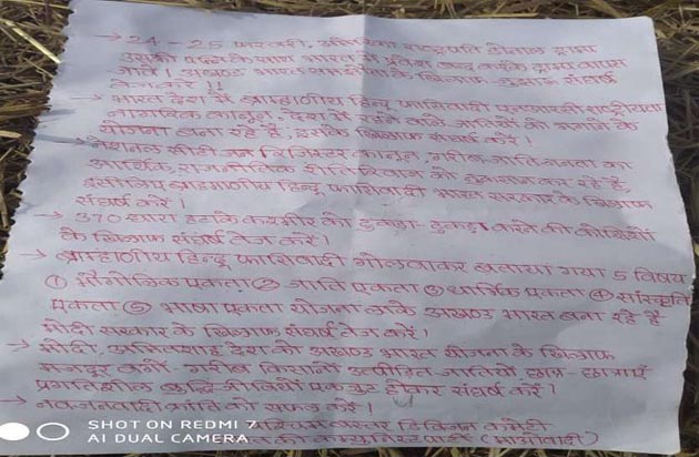 यह पर्चा नक्सलियों के पश्चिम बस्तर डिवीजन कमेटी द्वारा जारी किया गया है। नक्सलियों ने लिखा है कि, 24 फरवरी को अमेरिका के राष्ट्रपति एवं उनकी पत्नी दोनों का भारत में प्रवेश बंद करने तथा अखंड भारत के खिलाफ जूझारू संघर्ष तेज करने सहित सीएए, एनआरसी एवं धारा 370 को तत्काल प्रभाव से बंद करने की बात नक्सलियों ने पर्चे में लिखा है।