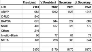 हंगामे और विवाद के बाद सेंट्रल पैनल के लिए गिने गए कुल 5170 वोटों में सभी चार पदों- अध्यक्ष, उपाध्यक्ष, महासचिव और संयुक्त सचिव- पर वाम मोर्चा के उम्मीदवारों ने जीत दर्ज की।