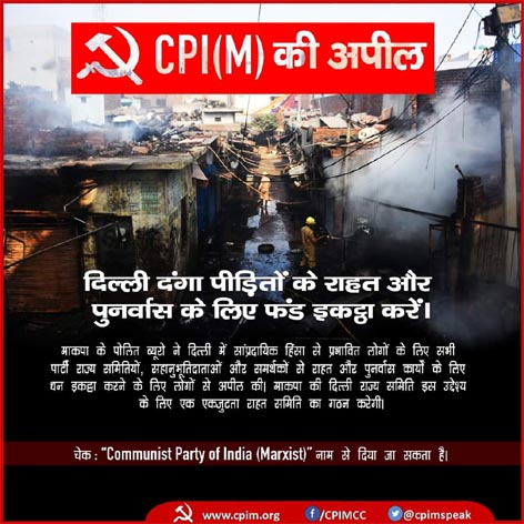 रायपुर:- मार्क्सवादी कम्युनिस्ट पार्टी ने हाल ही में उत्तर-पूर्व दिल्ली के इलाकों में हुए सांप्रदायिक दंगों से पीड़ित प्रभावितों के लिए राहत फंड एकत्रित करने का आह्वान किया है। माकपा द्वारा दिल्ली में दंगा पीड़ितों और प्रभावितों के लिए बड़े पैमाने पर राहत और पुनर्वास का कार्य संचालित किया जा रहा है। अतः यह फंड चेक/डीडी के जरिये “Communist Party of India (Marxist)” के नाम पर सीधे माकपा केंद्रीय समिति कार्यालय, ए के गोपालन भवन, 27-29, भाई वीरसिंह मार्ग, गोल मार्केट, नई दिल्ली-1 के पते पर भेजा जा सकता है।