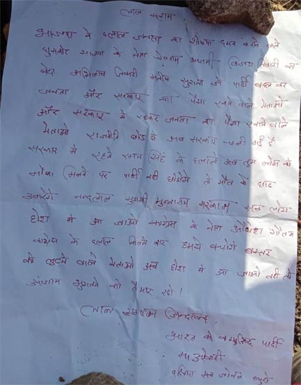 दंतेवाड़ा। दंतेवाड़ा जिले के गीदम थाना क्षेत्र के हारम चौक के पास आज तड़के सुबह नक्सली पर्चा मिला. जारी पर्चे में जिले के 6 भाजपा और एक कांग्रेस नेता को जान से मारने की धमकी दी गई है. दंतेवाड़ा के जिन नेताओं को जान से मारने की धमकी मिली है उनमें भाजपा जिला अध्यक्ष चैतराम अटामी, नंदलाल मुड़ामी, मनीष सुराना, विजय तिवारी, अभिलाष तिवारी, मुन्नाराम मरकाम का नाम शामिल है. वहीं एक कांग्रेस नेता अवधेश गौतम का भी सबसे अंत में लिखा गया है. इस कथित धमकी भरे पर्चे की जिम्मेदारी दक्षिण सब जोनल के नक्सलियों ने ली है.