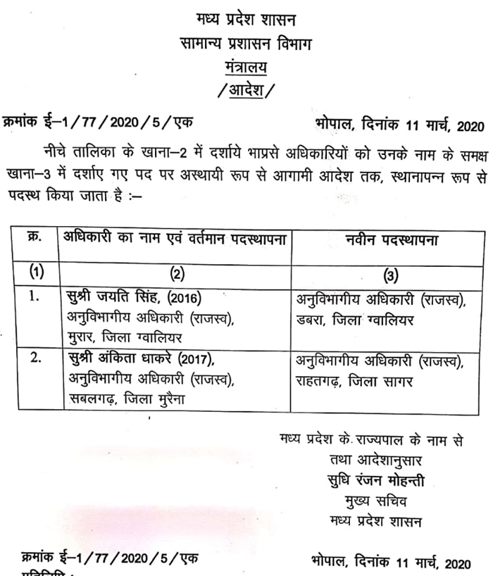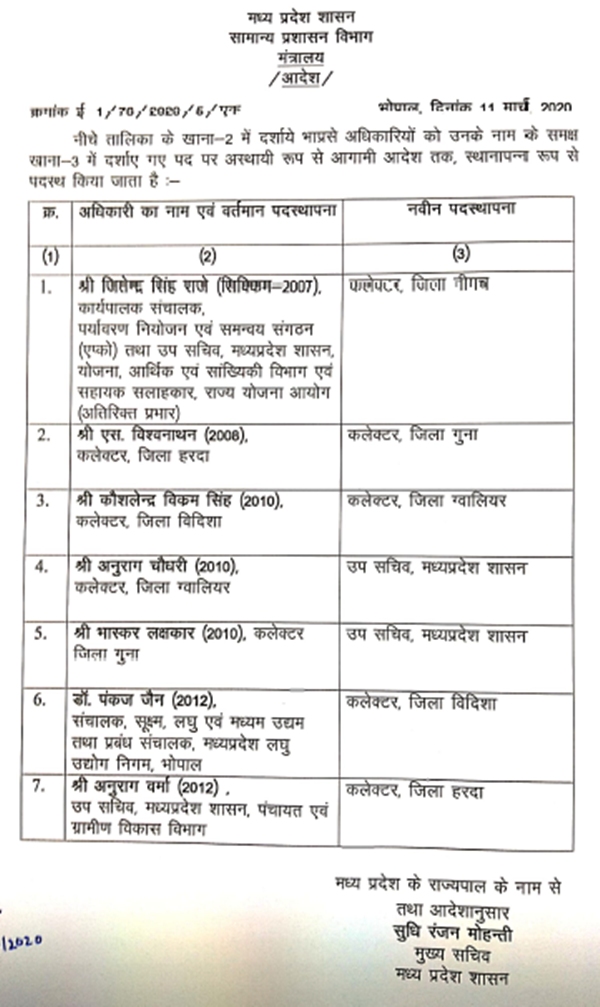 2010 बैच के आईएएस ग्वालियर कलेक्टर अनुराग चौधरी की छुट्टी हो गयी है, उन्हें मंत्रालय में उप सचिव बनाया गया है। गुना कलेक्टर को भी राज्य सरकार ने वापस बुला लिया है। 2010 बैच के आईएएस और गुना कलेक्टर भास्कर लक्षकार को भी मंत्रालय में उप सचिव बना दिया गया है। 2012 बैच के आईएस पंकज जैन को विदिशा का कलेक्टर बनाया गया है, वहीं 2012 बैच के आईएएस अनुराग वर्मा को हरदा का नया कलेक्टर बनाया गया है।