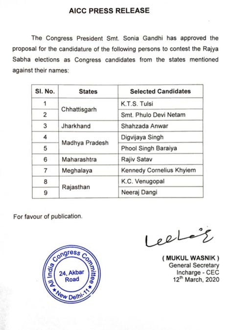 आपको बता दें कि प्रदेश में दो सीटें राज्यसभा की खाली हो रही है। एक सीट पहले भाजपा की थी, लेकिन मौजूदा संख्या बल के हिसाब वो सीट भी अब कांग्रेस के पास चली आयी है। मोतीलाल वोरा और रणविजय सिंह जूदेव की सीट पर इस बार फुलोदेवी नेताम और केटीएस तुलसी को राज्यसभा भेजा जायेगा।