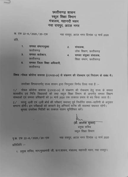 रायपुर। छत्तीसगढ़ में कोरोना वायरस के संभावित खतरे को देखते हुए राज्य सरकार ने बड़ा फैसला लिया है। राज्य सरकार ने प्रदेश के सभी स्कूलों को 31 मार्च तक के लिए बंद कर दिया है। आज से ये आदेश प्रभावी हो जायेगा। हालांकि अभी तक छत्तीसगढ़ में कोरोना संक्रमित एक भी मरीज नहीं मिला है, बावजूद राज्य सरकार सतर्कता बरत रही है। 31 मार्च तक की छुट्टी की पुष्टि खुद डीपीआई जितेंद्र शुक्ला ने की है।
