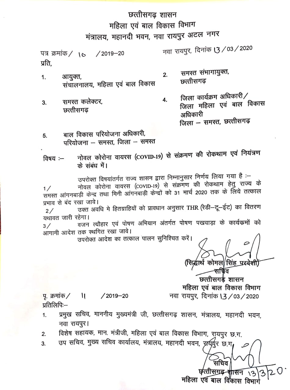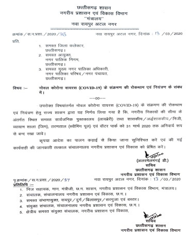 रायपुर:- नोवल कोरोना वायरस (COVID-19) के संक्रमण की रोकथाम एवं नियंत्रण के लिए नगरीय निकायों की सीमा के अंतर्गत स्थित सभी सार्वजनिक पुस्तकालय (लाइब्रेरी) तथा शासकीय, अर्धशासकीय और निजी व्यायाम शाला (जिम), तरणताल (स्वीमिंग पुल) एवं वॉटर पार्क अनिवार्य रूप से 31 मार्च 2020 तक बंद रहेगा।नगरीय प्रशासन विभाग की सचिव श्रीमती अलरमेलमंगई डी. ने नोवल कोरोना वायरस (COVID-19) के संक्रमण की रोकथाम एवं नियंत्रण के लिए प्रदेश के सभी कलेक्टरों, नगर निगम आयुक्तों और नगर पालिका परिषद-नगर पंचायतों के मुख्य नगर पालिका अधिकारियों को पत्र प्रेषित कर इस संबंध में आवश्यक निर्देश दिए हैं। पत्र में कहा गया है कि इस निर्देश का कड़ाई से पालन सुनिश्चित करते हुए की गई कार्यवाही से अवगत कराया जाए।