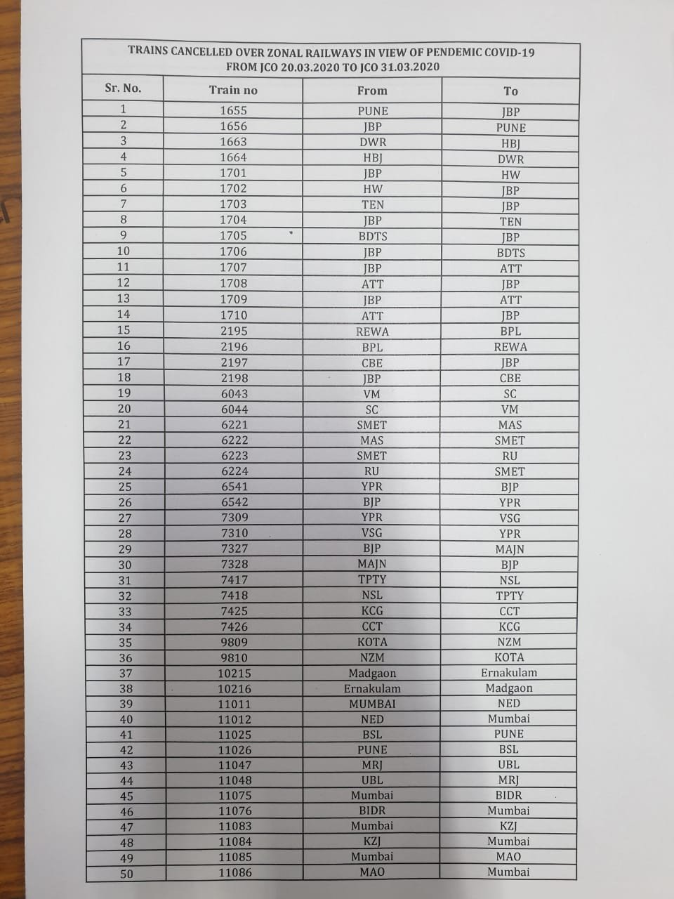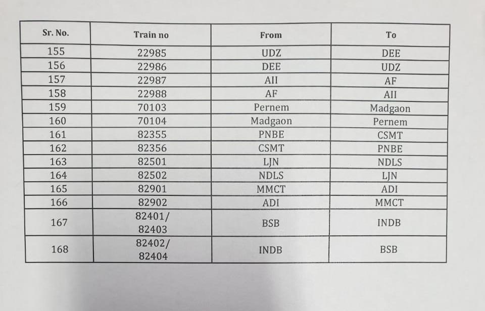 4. दिनांक 21, 24, 28 एवं 31 मार्च 2020 को कुर्ला से रवाना होने वाली गाडी संख्या 22885 कुर्ला-टाटा हमसफर एक्सप्रेस रद्द रहेगी।