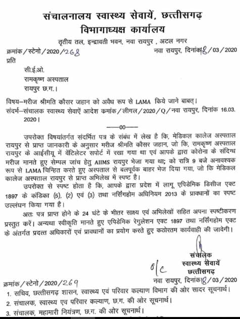 प्रपत्र में उल्लेखित है कि मेडिकल कॉलेज अस्पताल रायपुर से प्राप्त जानकारी के अनुसार रामकृष्ण केयर अस्पताल में आईसीयू वेंटिलेटर सपोर्ट पर भर्ती मरीज कौसर जहान को आपके अस्पताल द्वारा कोरोना का संदिग्ध मानते हुए सैंपल जांच के लिए एम्स रायपुर रिफर किया गया बाद में उन्हें अनावश्यक रूप से लामा ‘चिकित्सकीय सलाह विरुद्ध डिस्चार्ज’ चिन्हित करते हुए अस्पताल से बलपूर्वक बाहर भेजा गया। वहीं स्वास्थ्य विभाग पूरे मामले में गंभीर नजर आ रहा है और संतोषजनक जवाब नहीं मिलने की स्थिति में कठोर कार्रवाई कर सकता है।