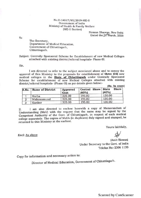 रायपुर:- राज्य स्तरीय बैठक में जिला कलेक्टर जमीन चिन्हांकन की जानकारी दे चुके हैं , जल्दी ही आगे की कार्यवाही शुरू की जाएगी। सभी जिलों के नागरिकों में इस खबर से खुशी की लहर है , रायपुर बिलासपुर पर चिकित्सकीय निर्भरता खत्म होगी , जिला चिकित्सालय से सम्बद्ध किये जाने वाले इन चिकित्सा महाविद्यालयों के खुलने से इलाकों में रोजगार के अवसर बढ़ेंगे। विशेषकर कांकेर के आदिवासी क्षेत्रों के लोगों को इसका अधिक लाभ होगा। नक्सल पुलिस मुठभेडों पर जख्मियों के उपचार में भी शीघ्र लाभ मिल सकेगा।