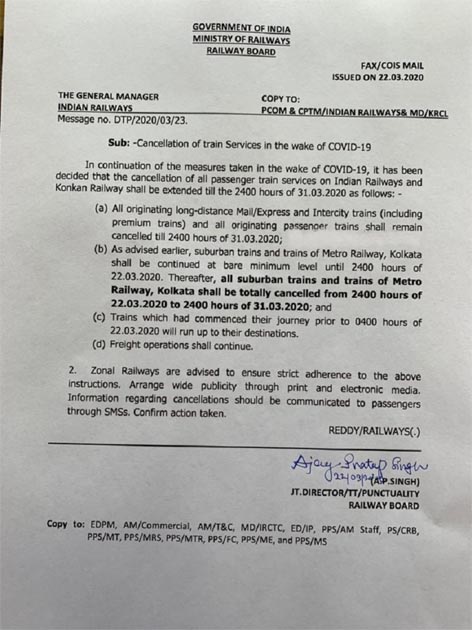 रेल मंत्रालय की ओर से सभी महाप्रबंधकोंको जारी निर्देश के अनुसार 31 मार्च की उक्त अवधि के दौरान कोई भी जोन अपने यहां से कोई ट्रेन नहीं चलाएगा. इसका मतलब हुआ कि देश भर में रोजाना चलने वाली 2400 पैसेंजर ट्रेने तथा 1300 मेल/एक्सप्रेस ट्रेने नहीं चलेंगी. रेलवे मंत्रालय के मुताबिक, 31 मार्च तक मालगाड़ियां चलेंगी. कोरोना के संक्रमण से आम जनता को बचाने के लिए यह कदम उठाया गया है. ट्रेनों में सामान्य रूप से अक्सर भीड़ होती है. सारे कोच खचाखच भरे रहते हैं. ऐसे में संक्रमण बहुत घातक रूप ले सकता है.