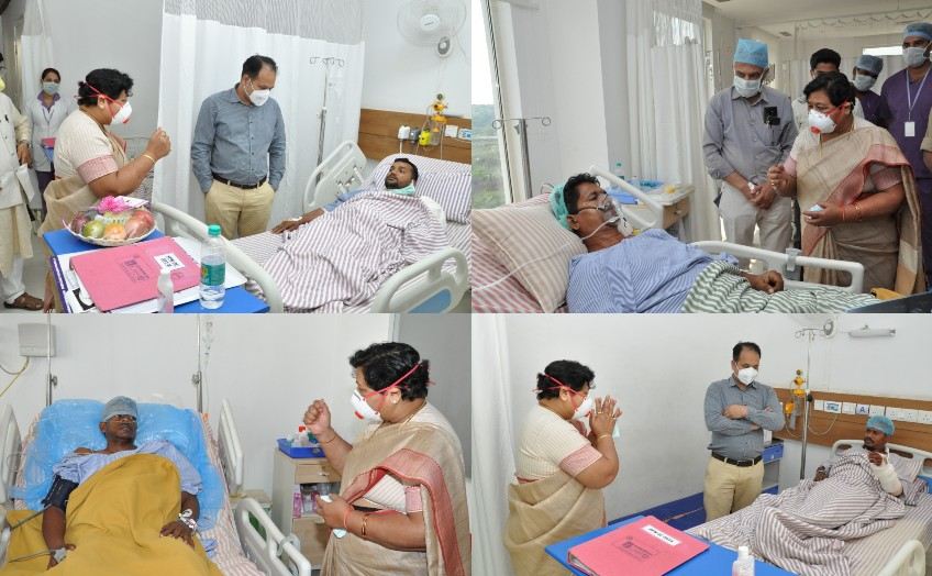 रायपुर। राज्यपाल सुश्री अनुसुईया उइके ने आज सुकमा नक्सली मुठभेड़ में घायल हुए जवानों से मुलाकात की और कुशलता के बारे में पूछा। राज्यपाल ने कहा- मैं आप लोगों को सेल्यूट करती हूं, जिस बहादुरी से नक्सलियों का सामना किया। आप जल्दी स्वस्थ हों, आप लोगों के इलाज में किसी भी प्रकार की कमी नही होने दी जाएगी। उन्होंने घायल जवानों के बेहतर इलाज के लिए निर्देश दिए और जल्द स्वास्थ्य लाभ की कामना की। उन्होंने कहा शहीद हुए जवानों के परिवाजनों को भी प्रणाम करती हु राज्यपाल ने चिकित्सको और अस्पताल के कर्मचारियों की जवानों के बेहतर देखभाल के लिए सराहना की और उन्होंने जवानों को फल भी वितरित किये।