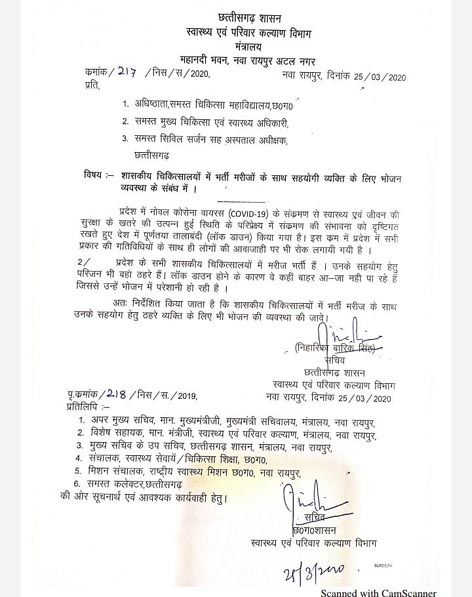 रायपुर। केंद्र सरकार ने 21 दिन तक पूरे देश में लॉकडाउन करने का निर्देश जारी किया है। इसी कड़ी में स्वास्थ्य विभाग ने प्रदेश के सरकारी अस्पतालों में भर्ती मरीजों और उनके परिजनों को दिक्कतों का सामना न करना पड़े। इसलिए स्वास्थ्य मंत्री टी एस सिंहदेव ने अस्पतालों को भोजन की व्यवस्था कराने के निर्देश दिए हैं। जिस पर स्वास्थ्य विभाग ने तत्परता दिखाते हुए सभी सरकारी अस्पतालों में भर्ती मरीजों और उनके परिजनों के लिए भोजन व्यवस्था करने के संबंध में आदेश भी जारी कर दिया है। स्वास्थ्य सचिव निहारिका बारिक ने आदेश जारी किया है। आदेश में उल्लेखित है कि लॉकडाउन के कारण मरीज के परिजन कहीं भी आना—जाना नहीं कर पा रहे है। जिससे उनके लिए भोजन की व्यवस्था कराई जा रही है। स्वास्थ्य मंत्री टीएस सिंहदेव ने मरीजों के परिजनों की परेशानियों को देखते हुए यह निर्णय लिया है।