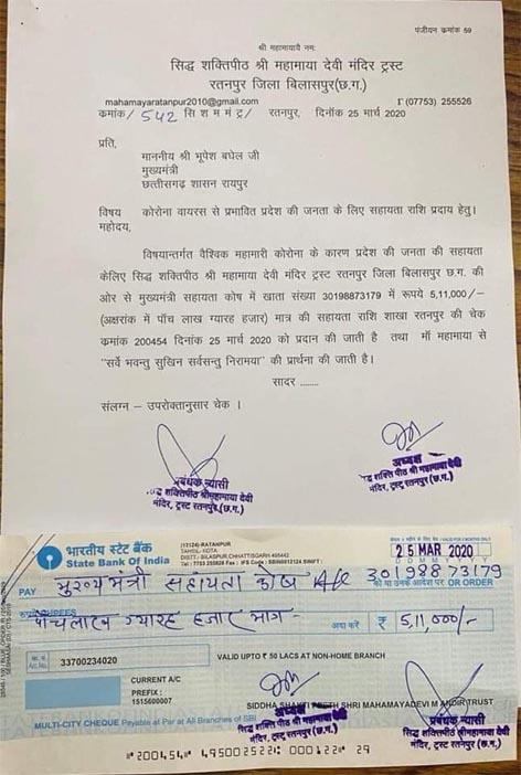 Home छत्तीसगढ़ माता महामाया ट्रस्ट रतनपुर ने 5,11,000 रु दिए मुख्यमंत्री राहत कोष में छत्तीसगढ़ माता महामाया ट्रस्ट रतनपुर ने 5,11,000 रु दिए मुख्यमंत्री राहत कोष में By ADMIN - March 26, 2020 891 0 FacebookTwitterPinterestWhatsApp रतनपुर:- छत्तीसगढ़ के प्रसिद्ध रतनपुर महामाया मंदिर ट्रस्ट में मुख्यमंत्री राहत कोष में पांच लाख ग्यारह हजार रुपया दान देने की घोषणा की है। ट्रस्ट द्वारा पत्र एवं चेक के द्वारा सूचना दी गयी है तथा प्रदेश के नागरिकों के स्वास्थ्यलाभ की कामना की गई है।