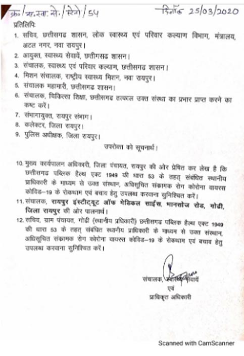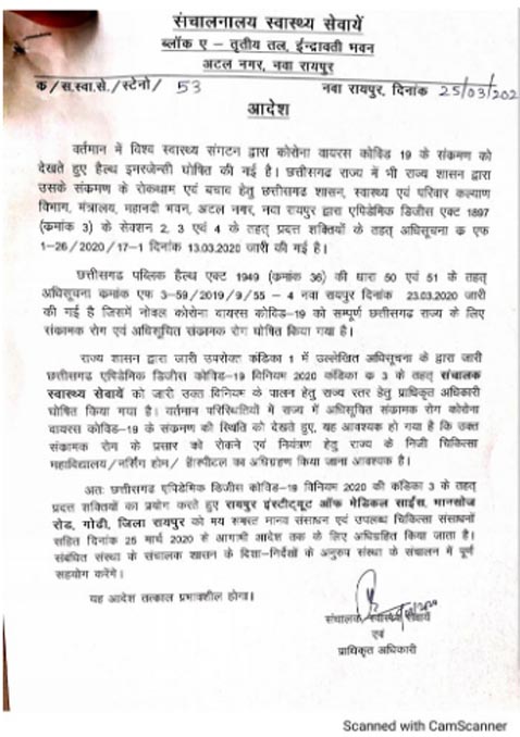 आदेश में कहा गया है कि छत्तीसगढ एपिडेमिक डिजीस कोविङ-19 विनियम 2020 की कंडिका 3 के तहत् प्रदत्त शक्तियों का प्रयोग करते हुए रायपुर इंस्टीट्यूट ऑफ मेडिकल साईस, भानसोज रोड, गोढी, जिला रायपुर को मय समस्त मानव संसाधन एवं उपलब्ध चिकित्सा संसाधनों सहित दिनांक 25 मार्च 2020 से आगामी आदेश तक के लिए अधिग्रहित किया जाता है.