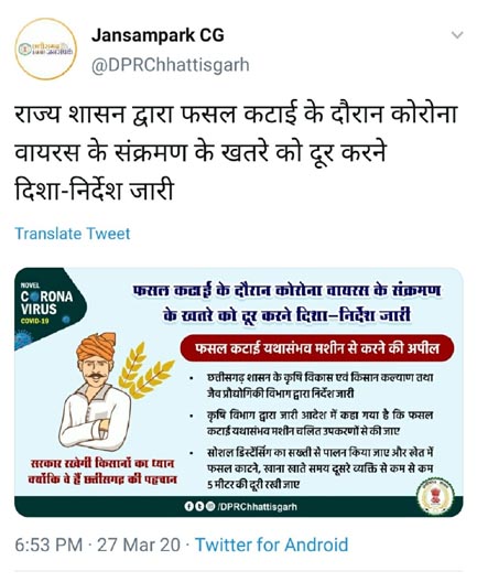 कवर्धा- कलेक्टर श्री अवनीश कुमार शरण ने छत्तीसगढ़ शासन कृषि विकास एवं किसान कल्याण तथा जैव प्रोद्योगिकी विभाग मंत्रालय द्वारा जारी आदेश के तहत फसल कटाई कार्य में कोरोना वायरस (कोविड-19) के संक्रमण के खतरे को दूर करने के लिए दिशा-निर्देश जारी किया गया है। उन्होने निर्देश देते हुए कहा कि फसल कटाई यथा संभव मशीन चलित उपकरणों से की जाए। हस्त चलित कटाई उपकरण काम में लेने पर उपकरणों को दिन में कम से कम 3 बार साबुन के पानी से कीटाणु रहित करना होगा। फसल कटाई में सोशल डिस्टेंसिंग की सख्ती से पालन की जाएं। खेत में फसल काटने, खाना खाते समय एक व्यक्ति से दूसरे के मध्य कम से कम 5 मीटर की दूरी रखी जाए। खाने के बर्तन अलग-अलग रखें तथा प्रयोग पश्चात साबुन के पानी से अच्छी तरह साफ करें। एक व्यक्ति द्वारा काम लिये जाने वाले उपकरण को दूसरा व्यक्ति कदापी काम में न लें।