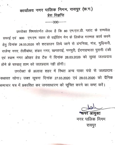 Home छत्तीसगढ़ नही आएगा आज शाम नलों से पानी.. आदेश जारी छत्तीसगढ़ नही आएगा आज शाम नलों से पानी.. आदेश जारी By ADMIN - March 28, 2020 620 0 FacebookTwitterPinterestWhatsApp रायपुर:- नगर पालिक निगम द्वारा जारी एक पत्र में जानकारी दी गयी है कि आज रायपुर के बहुत बड़े हिस्से में शाम को नलों से पानी की सप्लाई बंद रहेगी। निगम द्वारा नागरिकों को जल से सदुपयोग की अपेक्षा की गई है।