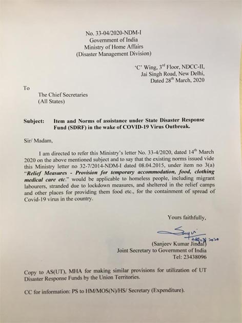 प्रवासी मजदूरों, बेघरों और अपने घर जाने के रास्ते में फंसे लोगों के लिए केंद्र का बड़ा ऐलान। राज्य ऐसे लोगों की खाने-पीने और राहत कैंप में रुकने सहित अन्य मदद राज्य आपदा प्रतिक्रिया कोष (SDRF) के जरिए कर सकते हैं।