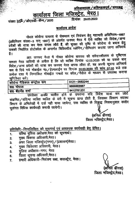 12 मार्च के बाद विदेश या अन्य राज्यों से आये सभी व्यक्तियों को अपनी कोरोनॉ जांच कराने के लिये मेडिकल कालेज में सैम्पल दे या अनिवार्य 30 मार्च शाम 7 बजे तक सेम्पल देना अनिवार्य जिलाधिकारी अनिल ढींगरा ने दिए आदेश अगर सेम्पल नही दिए और फिर भी उसको या उसके मोहल्ले गांव में कोई संक्रमण से पाया गया तो होगी कड़ी कार्यवाही।