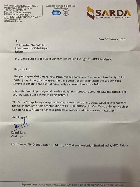 सारडा ग्रुप के चेयरमैन कमल सारडा ने मुख्यमंत्री को भेजे अपने पत्र में कहा है कि पूरे विश्व मे कोरोना वायरस की महामारी के कारण गरीब तथा दिहाड़ी मजदूरों और बाहर से आने वाले लोगो का जीवन बुरी तरह से प्रभावित किया है । छत्तीसगढ़ में भी इन वर्गों का जीवन प्रभावित हुआ है। उन्होंने कहा कि मुख्यमंत्री के कुशल नेतृत्व में जरूरतमंदों की मदद के लिए संकट की इस घड़ी में आगे बढ़कर मदद की जा रही है वह प्रसंशनीय है। संकट की घड़ी में एक जिम्मेदार कम्पनी होने के नाते सारडा ग्रुप भी जरूरतमंदो की सहायता के लिए एक करोड़ रुपए की सहायता दे रहा है।