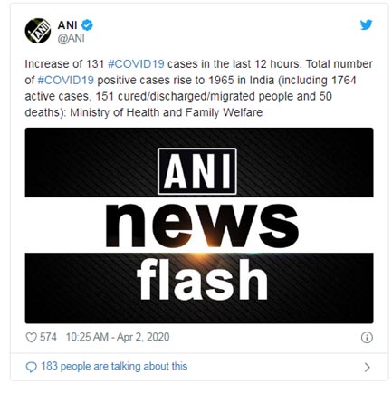 Home देश पिछले 12 घंटों में देश में कोरोना वायरस के 131 मामले… अब... देश पिछले 12 घंटों में देश में कोरोना वायरस के 131 मामले… अब तक 50 लोगो की मौत…151 लोग हुए ठीक By ADMIN - April 2, 2020 469 0 FacebookTwitterPinterestWhatsApp file photo बीते 12 घंटों में कोरोना वायरस के मामलों में 131 की बढ़त हुई है। भारत में कोरोना वायरस के मामलों की संख्या बढ़कर 1965 हो गई है (इसमें 1764 मामलों में अभी संक्रमण है, 151 ठीक/ डिस्चार्ज/ विस्थापित लोग और 50 मौतें शामिल हैं.