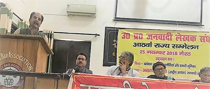 प्रतिनिधियों का स्वागत करते हुए जिला सचिव मुनेश त्यागी ने कहा कि आज अमीरी और गरीबी के पहाड खडे कर दिए गये हैं। संविधान, कानून के शासन और गंगा जमनी तहजीब पर हमलें जारी हैं। साहित्य को राजनीति के मातहत किया जा रहा है जो सच नही है। साहित्य राजनीति के आगे चलने वाली मशाल है। आज पूंजी और साम्प्रदायिकता के गठजोड़ ने समाज के सामने बहुत बडी चुनौती खडी कर दी है। हमें जनवादी और समाजवादी मूल्यों को जनता की सोच का हिस्सा बनाना पडेगा।